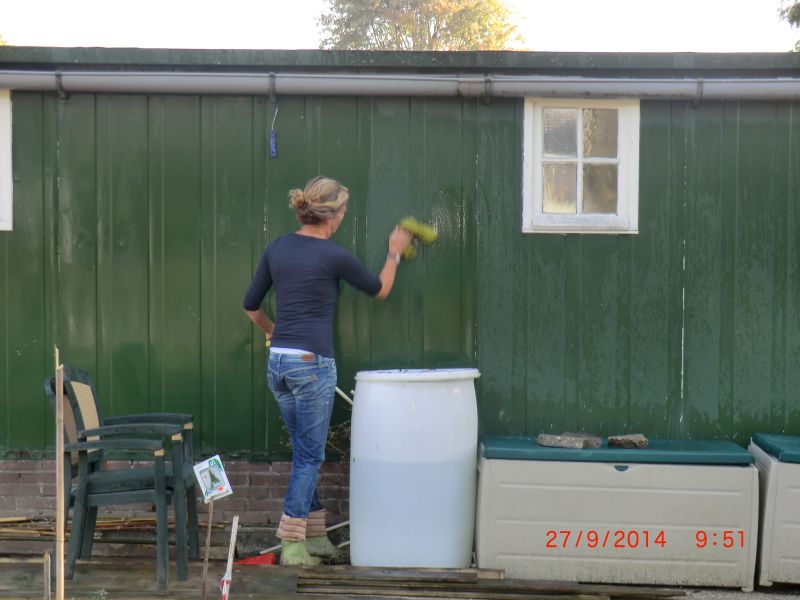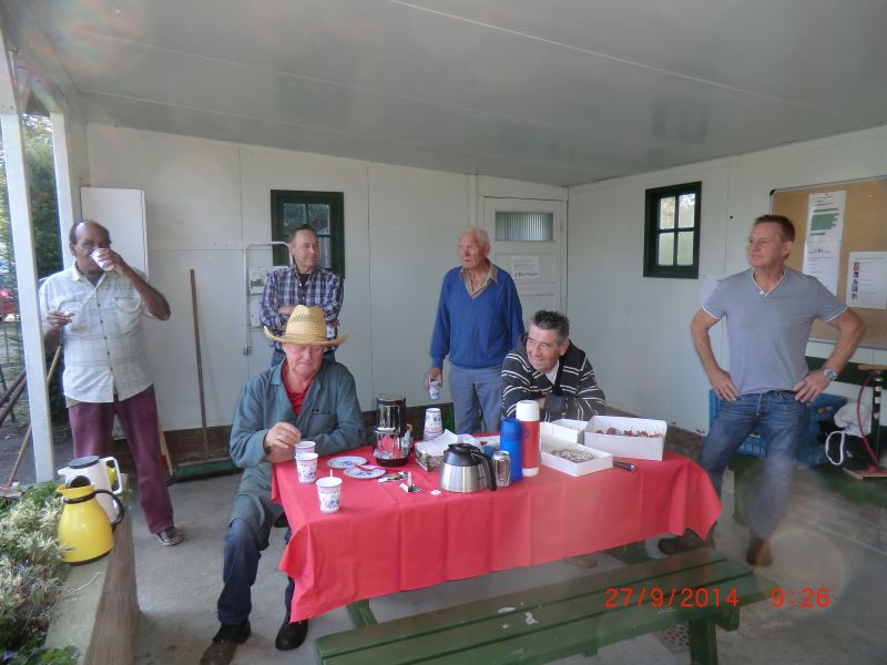 De dag beginnen met een kopje koffie en de heerlijke gebakjes die Willem Duijs weer meegenomen had. Daarna met zijn allen de entree weer netjes gemaakt, sloot uitgebaggerd, wat wilgen gesnoeid en een complete tuin leeg gehaald zodat hij weer klaar is voor een nieuwe huurder.